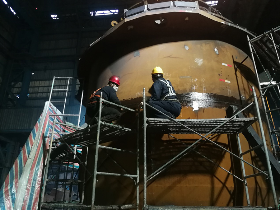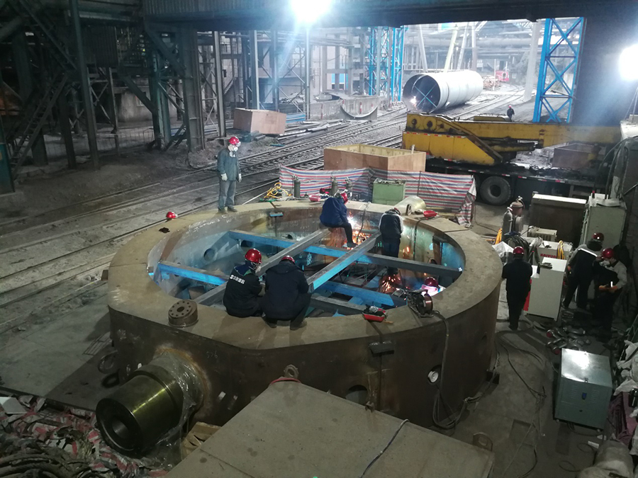 時(shí)間就是效益,滿足客戶需求,讓客戶滿意是遼寧方大集團(tuán)北方重工全體員工的共同目標(biāo)。為盡快完成轉(zhuǎn)爐項(xiàng)目現(xiàn)場(chǎng)施工,給用戶創(chuàng)造價(jià)值,焊接工人連續(xù)工作,質(zhì)檢、探傷人員緊密配合,每天早七晚十,持續(xù)作業(yè)?,F(xiàn)場(chǎng)服務(wù)人員在爐腔內(nèi)施工,作業(yè)空間密閉、狹小,但為保證質(zhì)量、節(jié)省時(shí)間,他們經(jīng)?!霸苯惑w半個(gè)小時(shí)不出來。寒冬季節(jié),當(dāng)他們從爐體鉆出來時(shí),單衣已被汗水打透。上下爐殼接口內(nèi)部焊縫焊接位置被支撐遮擋,大家只能半爬半跪的窩在支撐上進(jìn)行焊接。每前進(jìn)一步都需要用“膝蓋當(dāng)腳,一步一跪”的完成焊接工作,他們就是這樣用膝蓋丈量了整個(gè)內(nèi)部環(huán)縫的長(zhǎng)度。