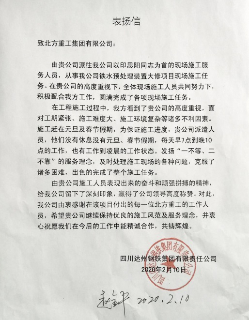 歷時(shí)34天,出色完成四川達(dá)鋼轉(zhuǎn)爐改造項(xiàng)目,順利通過用戶驗(yàn)收,遼寧方大集團(tuán)北方重工安裝人員以嚴(yán)謹(jǐn)?shù)墓ぷ鲬B(tài)度,飽滿的工作熱情,高超的技術(shù)水平得到了用戶的贊揚(yáng)和肯定。