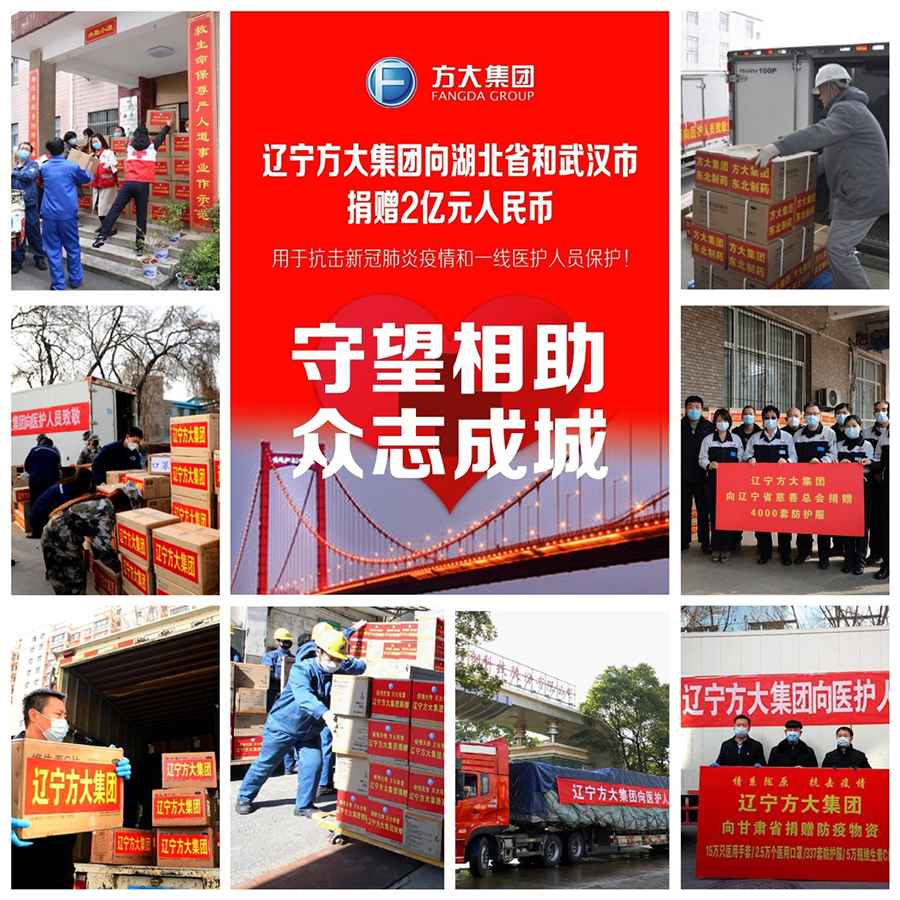 1月28日,遼寧方大集團(tuán)向湖北省和武漢市捐贈(zèng)2億元人民幣;2月2日、9日,方大群眾醫(yī)院重癥醫(yī)學(xué)科護(hù)士胡楠楠和曹寧,醫(yī)院醫(yī)生劉兆崇及護(hù)士李春、曹露、徐曉萌、萬(wàn)佳彤兩批共7名醫(yī)護(hù)人員參加遼寧省馳援湖北醫(yī)療隊(duì),走上抗疫第一線;2月10日,方大集團(tuán)再次向湖北省和武漢市捐贈(zèng)當(dāng)前急需的防護(hù)服2萬(wàn)套;2月7日,方大集團(tuán)向家鄉(xiāng)沈陽(yáng)捐贈(zèng)急需醫(yī)用防護(hù)服;2月14日,方大集團(tuán)通過沈陽(yáng)市紅十字會(huì)向沈陽(yáng)醫(yī)護(hù)人員無(wú)償捐贈(zèng)26.5萬(wàn)只醫(yī)用外科手套;2月16日,方大集團(tuán)從加拿大緊急采購(gòu)的3500套防護(hù)服和14950雙防護(hù)靴在運(yùn)抵沈陽(yáng)后,第一時(shí)間捐贈(zèng)給遼寧省紅十字會(huì),同時(shí)捐贈(zèng)的還有30000只醫(yī)用手套;2月17日,方大集團(tuán)馳援江西10萬(wàn)瓶維生素C片、5萬(wàn)瓶乙醇消毒劑和50萬(wàn)只醫(yī)用手套等防疫物資;2月19日,又通過甘肅省紅十字會(huì)和蘭州市政府捐贈(zèng)了5萬(wàn)個(gè)醫(yī)用口罩、30萬(wàn)只防護(hù)手套、674套防護(hù)服和10萬(wàn)瓶維生素C防疫物資;2月24日,方大集團(tuán)再一次向家鄉(xiāng)沈陽(yáng)捐贈(zèng)23800套醫(yī)用防護(hù)服,這也是新冠肺炎疫情發(fā)生以來沈陽(yáng)市接受捐贈(zèng)數(shù)量最大、價(jià)值最高的一批防護(hù)服;2月25日,方大集團(tuán)又從境外采購(gòu)8000套防護(hù)服,通過遼寧省紅十字會(huì)和遼寧省慈善總會(huì)再一次捐贈(zèng)給了家鄉(xiāng)遼寧。