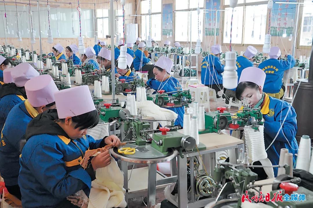 東鄉(xiāng)縣大樹(shù)鄉(xiāng)南陽(yáng)洼村扶貧車(chē)間東鄉(xiāng)族工人正在加工毛衣針織品